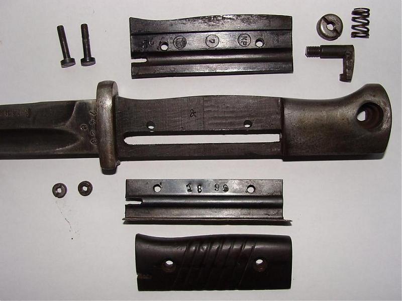 De handvatten bestaan uit 2 houten of bakkelieten plaatjes die aan beide zijden van het heft zitten. Deze zijn door 2 schroeven met elkaar verbonden. Met wat geluk kun je die wel los vinden, maar wellicht is het makkelijker en beter een andere complete bajonet te kopen in goede staat. Ook met handvat zal deze bajonet nooit echt gewild zijn.