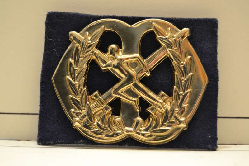 Twee gekruiste zwaarden met op het kruispunt een sprintende atletische figuur omgeven door 2 lauwertakken onderaan bijeengehouden door een strik.