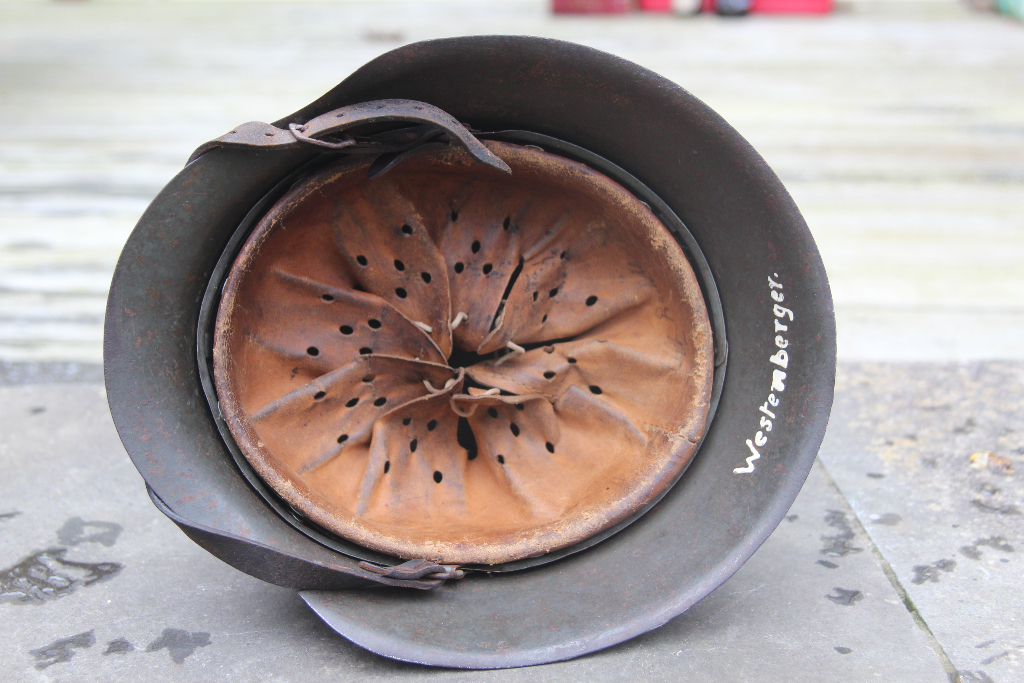 Eerst een mooie M42 helm met sporen van camo. Binnenwerk in mooie staat en genaamd.