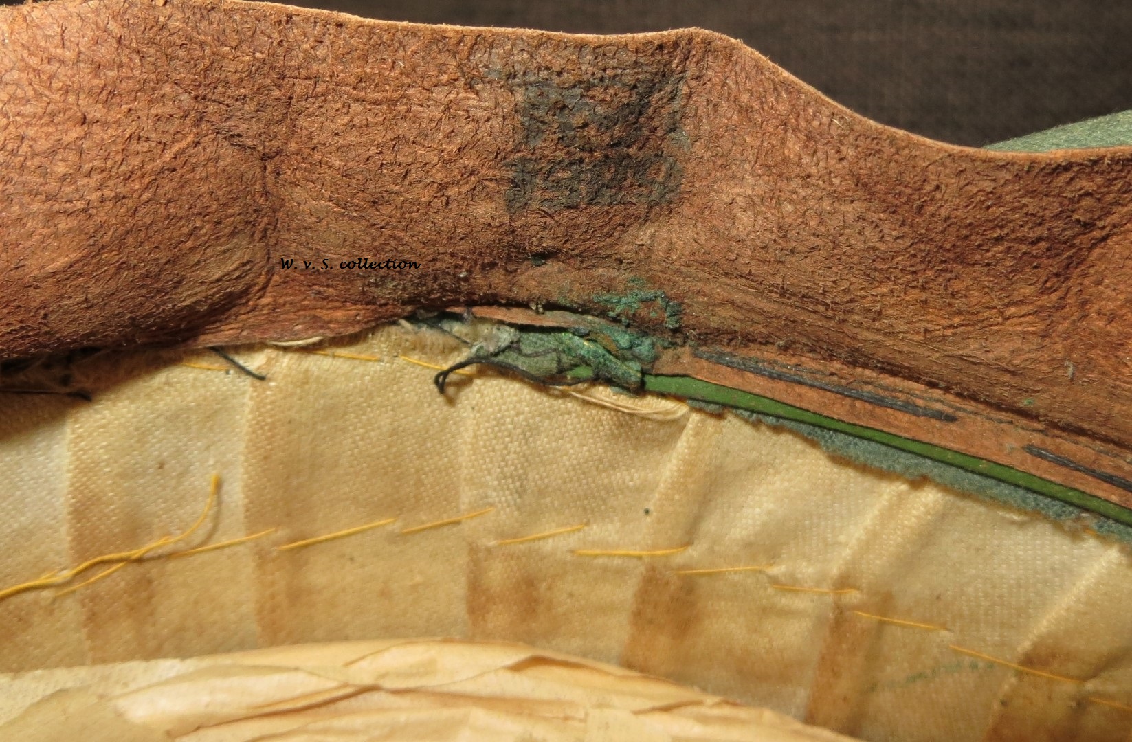 In de lederen zweetband zit een label met de initialen van de drager alsook een CM stempel waarvan het jaartal slecht is te lezen.