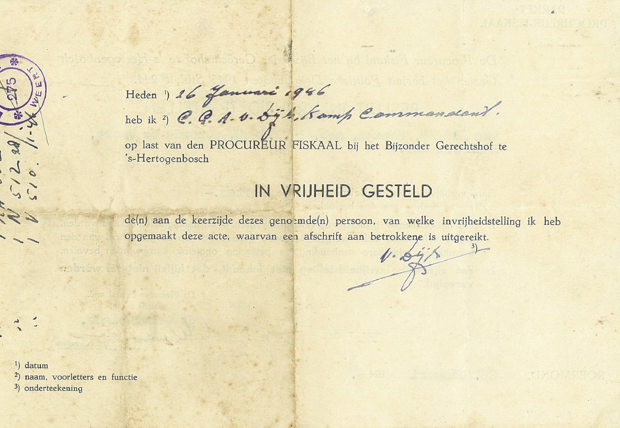 Het blijkt dat hij krijgsgevangen heeft gezeten in Pouxeux (Frankrijk) en Juvaincourt (Frankrijk). Verder zaten er nog officiele documenten bij dat hij als krijgsgevangene is “geprocessed” door de Amerikanen (met zijn krijgsgevangene nummer) maar ook papieren dat hij in vrijheid is gesteld door de Nederlandse regering.