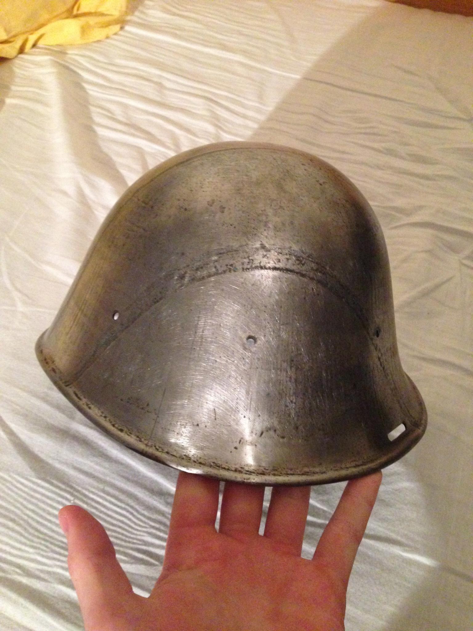 Goed, nadat ik de lasnaad ontdekte en de helm in kaal metaal onwijs mooi vond, kocht ik via MP nog een wat ik dacht waardeloze helm. De helm was blauw-groen geverfd met met daaronder nog een verflaag wit, daaronder zwart en daar weer onder (blijkbaar) de originele legerkleur. Aan de binnenkant was deze wel nog zichtbaar, maar onder de verf was de roest al flink toegeslagen dus ik was genoodzaakt ook deze verflaag weg te schuren. (De roest is na meerdere uren schuren en verschillende chemicaliën te hebben gebruikt nog steeds niet helemaal weg.)