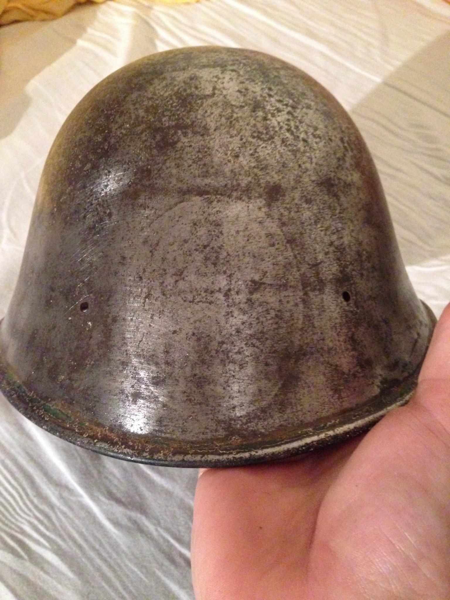 Goed, nadat ik de lasnaad ontdekte en de helm in kaal metaal onwijs mooi vond, kocht ik via MP nog een wat ik dacht waardeloze helm. De helm was blauw-groen geverfd met met daaronder nog een verflaag wit, daaronder zwart en daar weer onder (blijkbaar) de originele legerkleur. Aan de binnenkant was deze wel nog zichtbaar, maar onder de verf was de roest al flink toegeslagen dus ik was genoodzaakt ook deze verflaag weg te schuren. (De roest is na meerdere uren schuren en verschillende chemicaliën te hebben gebruikt nog steeds niet helemaal weg.)