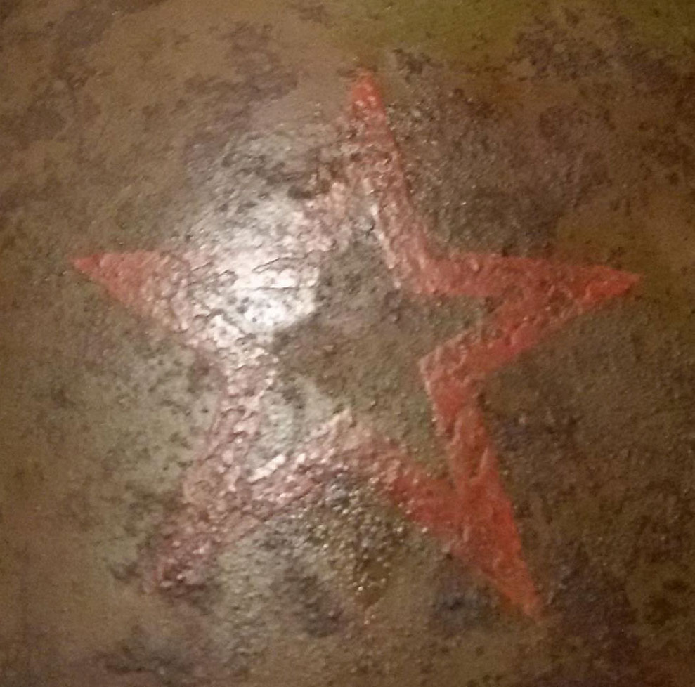 De rode outline ster voorop de helm doen bij wel de alarmbellen rinkelen. Wanneer ik jouw foto uitvergroot dan zul je zien waarom. De ster is over de roest en de beschadigingen heen aangebracht (zie foto).