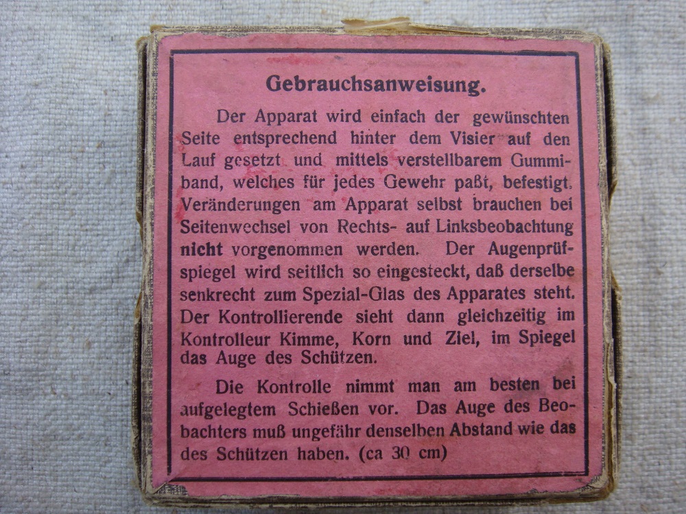Het gaat hier om een "Zielkontrollapparat" van voor/tijdens de 2de Wereldoorlog gemaakt door de firma Akah (Albrecht Kind). Dit toestel liet de instructeur toe om te zien waar de leerling-schutter naar richtte. Dit werd hoofdzakelijk gebruikt bij K98-training en de afgeleidde .22 versies.