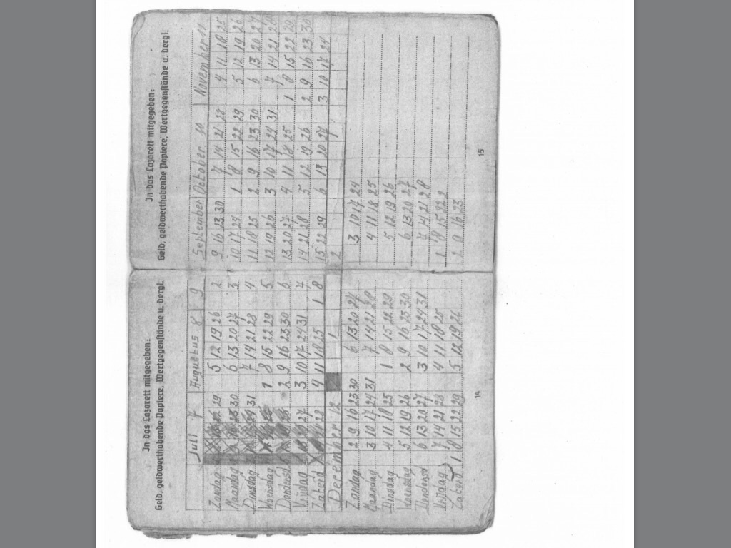 Kan je de feldpoststempels op pagina 23 lezen, de nummers? Dat zijn z'n verlofmomenten, op basisi van de veldpostnummers kan je de eenheden terugzoeken.