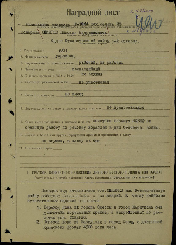 De voordracht vermeldt hoe Sokirko het drijvend dok succesvol van Odessa naar Marioepol voer zonder de hijskranen te demonteren, hoe hij het dok van Marioepol naar Kertsj bracht met 4500 ton hout voor het Krimfront, hoe hij het dok vervolgens van Kertsj naar Poti (Georgië) voer met een zware lading walsen, en hoe de lichte kruisers Krasny Kavkaz, Froenze en Molotov in het dok werden opgenomen. De voordracht werd opgesteld door de kapitein van de Molotov.