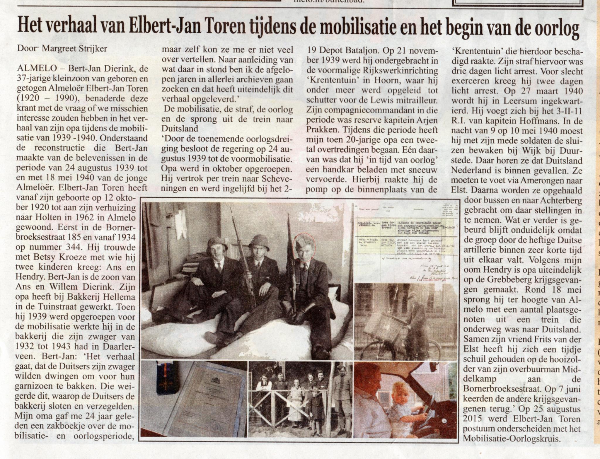 Elbert-Jan Toren heeft vanaf zijn geboorte op 12 oktober 1920 tot aan zijn verhuizing naar Holten in 1962 in Almelo gewoond. Eerst in de Bornerbroeksestraat 185 en vanaf 1934 op nummer 344. Hij trouwde met Betsy Kroeze met wie hij twee kinderen kreeg: Ans en Hendry. Bert-Jan is de zoon van Ans en Willem Dierink. Zijn opa heeft bij Bakkerij Hellema in de Tuinstraat gewerkt, maar toen hij 1939 werd opgeroepen voor de mobilisatie werkte hij in de bakkerij die zijn zwager van 1932 tot 1943 had in Daarlerveen. Bert-Jan: ‘Het verhaal gaat, dat de Duitsers zijn zwager wilden dwingen om voor hun garnizoen te bakken. Die weigerde dit, waarop de Duitsers de bakkerij sloten en verzegelden. Mijn oma gaf me 24 jaar geleden een zakboekje over de mobilisatieperiode, maar zelf kon ze me er niet veel over vertellen. Naar aanleiding van de informatie uit dat boekje ben ik de afgelopen jaren in allerlei archieven gaan zoeken en dat heeft uiteindelijk dit verhaal opgeleverd.’