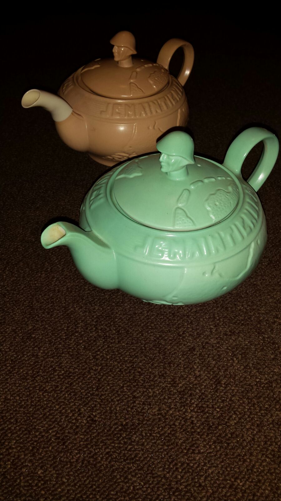 De Terracotta kleurige mobilisatie theepot. Dergelijke theepotten kwamen in drie kleuren op de markt; Terracotta, wit en de mintgroene versie die ik al had. Ze werden vervaardigd bij Mosa.