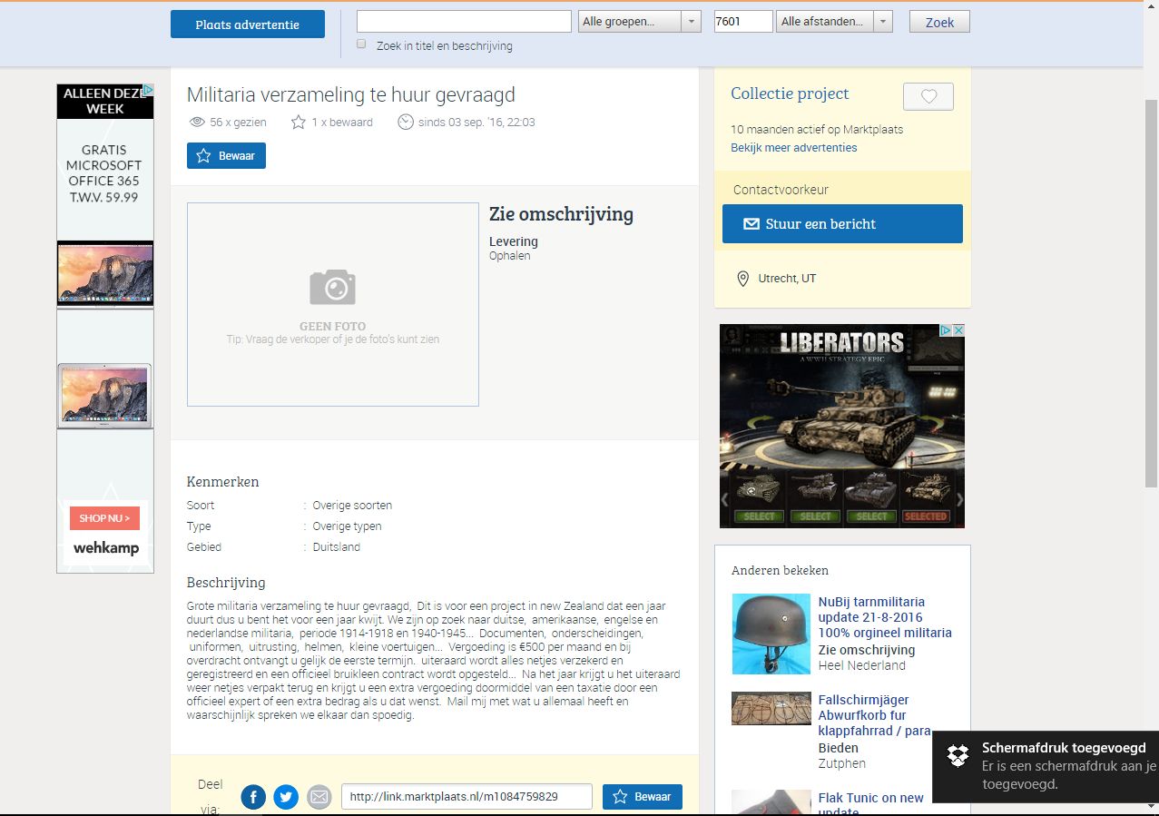 Grote militaria verzameling te huur gevraagd, Dit is voor een project in new Zealand dat een jaar duurt dus u bent het voor een jaar kwijt. We zijn op zoek naar duitse, amerikaanse, engelse en nederlandse militaria, periode 1914-1918 en 1940-1945... Documenten, onderscheidingen, uniformen, uitrusting, helmen, kleine voertuigen... Vergoeding is €500 per maand en bij overdracht ontvangt u gelijk de eerste termijn. uiteraard wordt alles netjes verzekerd en geregistreerd en een officieel bruikleen contract wordt opgesteld... Na het jaar krijgt u het uiteraard weer netjes verpakt terug en krijgt u een extra vergoeding doormiddel van een taxatie door een officieel expert of een extra bedrag als u dat wenst. Mail mij met wat u allemaal heeft en waarschijnlijk spreken we elkaar dan spoedig.