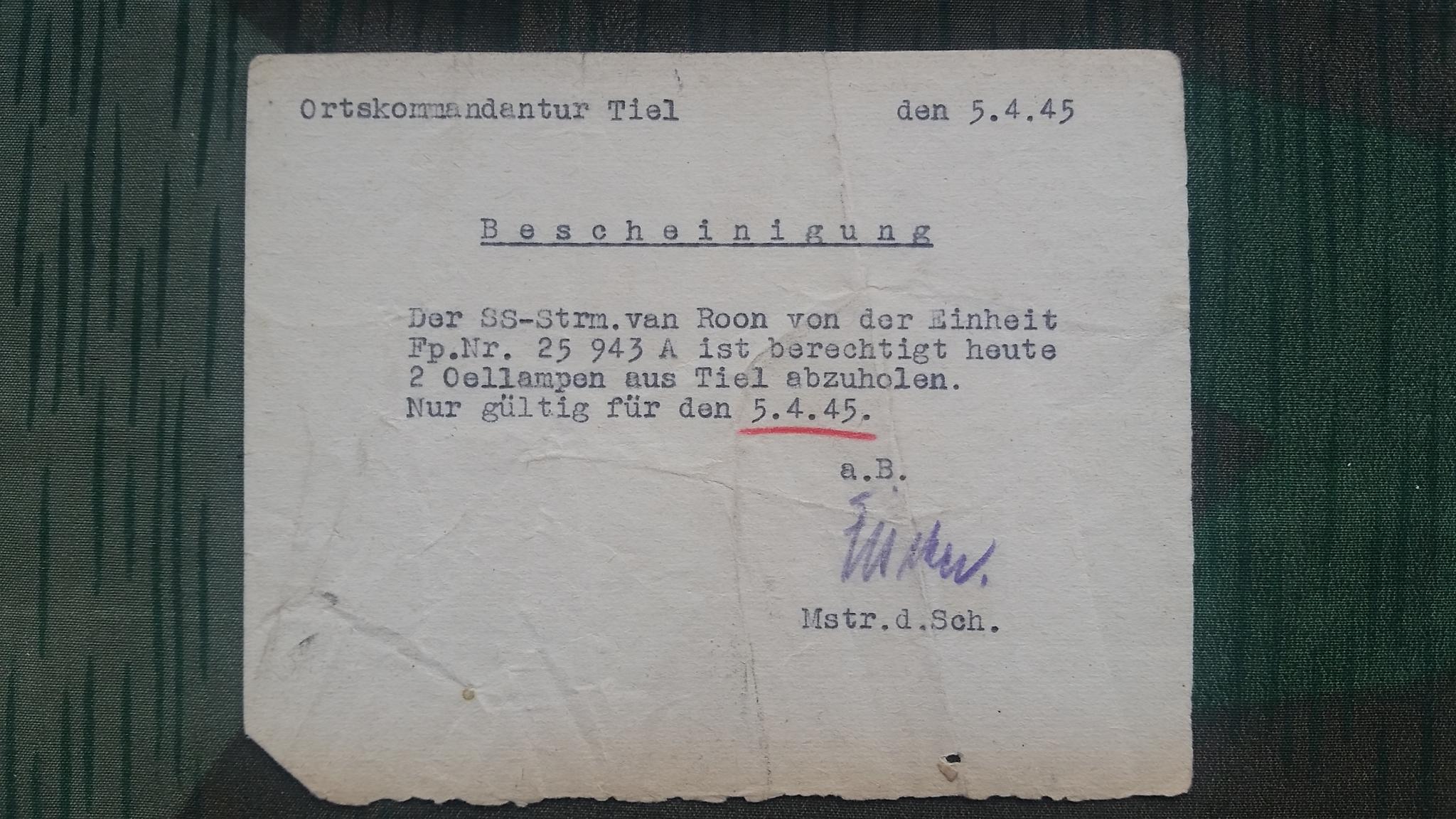 SS-sturmmann van Roon moest 2 olie lampen ophalen in Tiel en dit documentje zorgde ervoor dat hij niet zo worden opgepakt als deserteur.