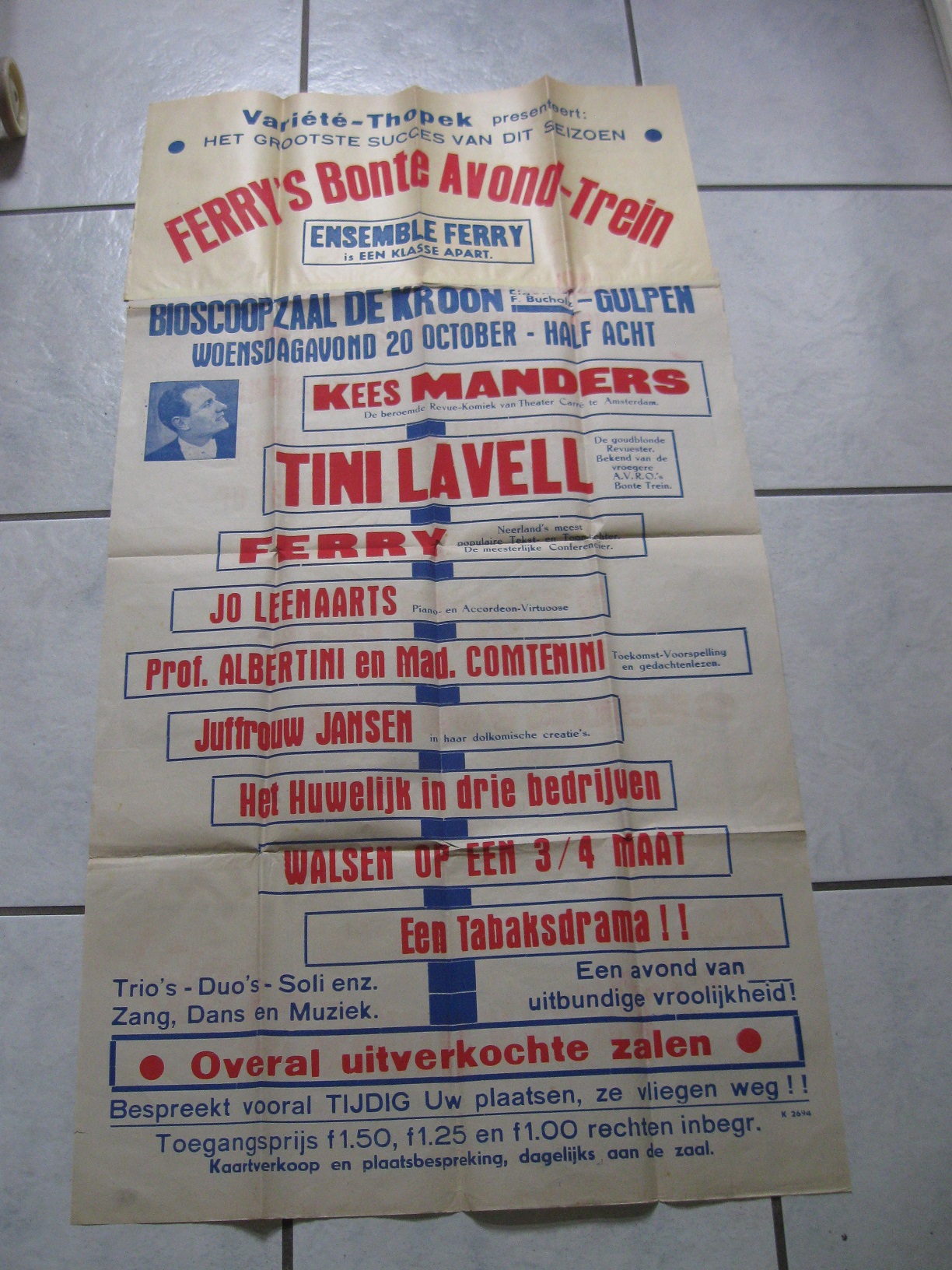 Ook het asument ging gewoon door tijdens WOII, zoals deze 2 affiches van Ferry's Bonte Avondtrein laten zien. Ferry (Van Delden) was een bekend liedjesschrijver, oa van Dorus. Hij was voor de oorlog getrouwd met een joodse, maar scheidde in 1939. Haar naam was Mietje Maas en werd door de nazi’s vermoord in het vernietigingskamp Sobibór op 30 april 1943. Hij hertrouwde met Tiny Lavell die ook aan het amusementsprogramma deelnam.