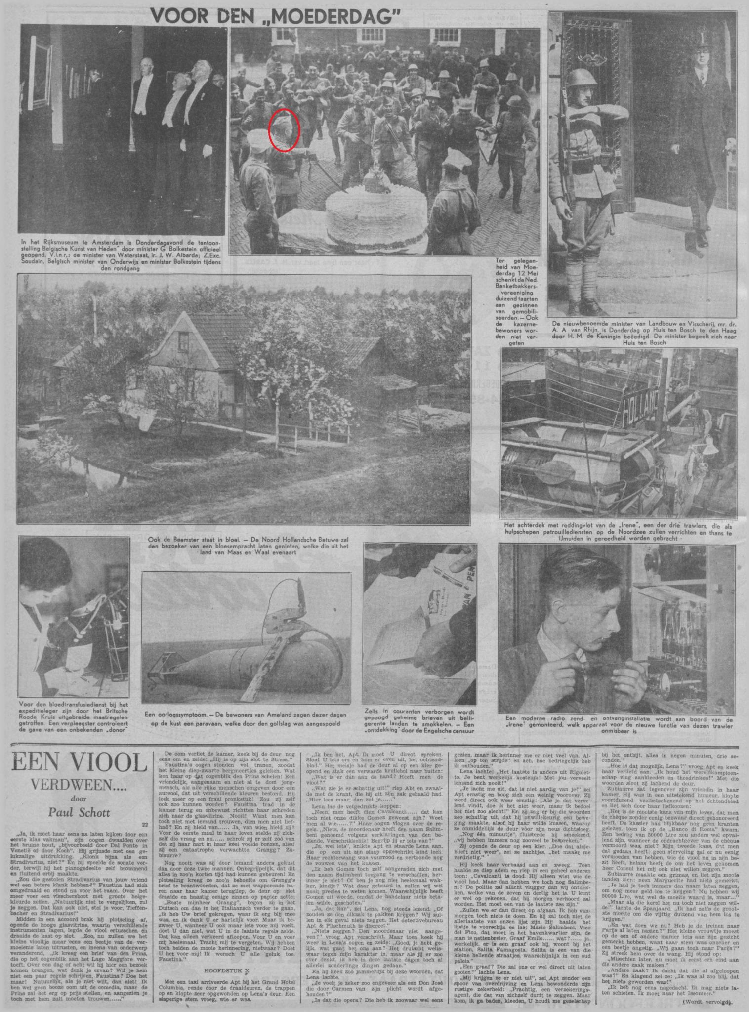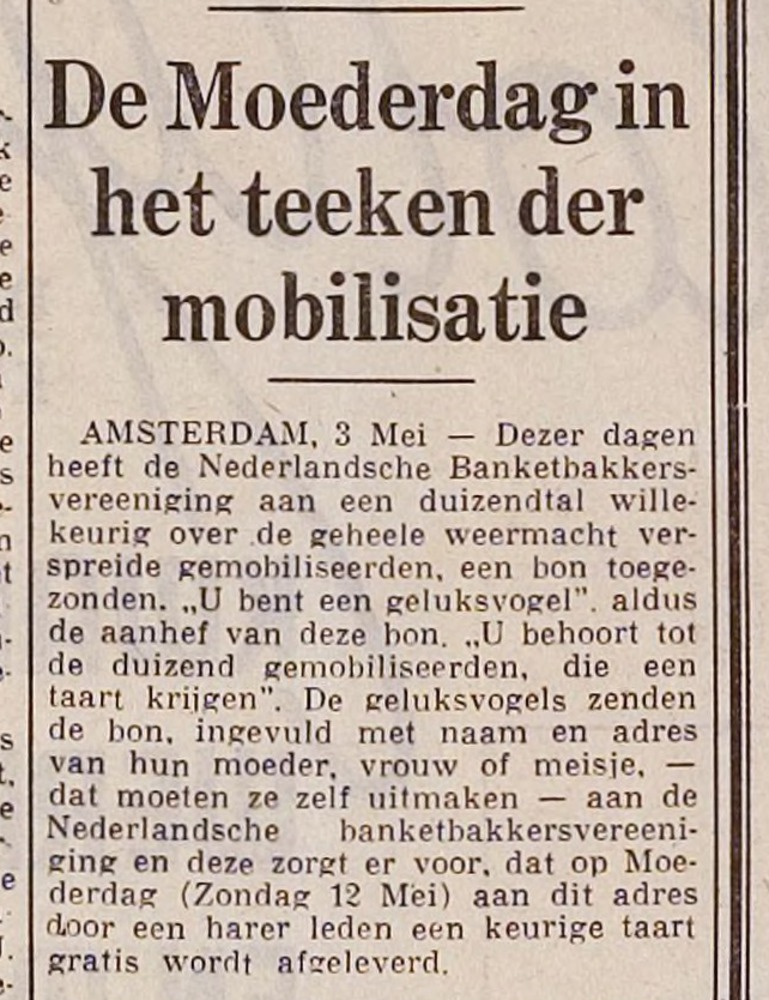 Vandaag weer een mooie aanvulling gevonden over het moment dat de heer van Loo de taart aansnijdt na aanleiding van de actie die de Nederlandsche banketbakkersvereeniging had i.v.m. Moederdag. Moederdag viel in 1940 op zondag 12 mei. En de banketbakkersvereeniging had als een soort van hart onder riem willekeurig 1000 bonnen verstuurd onder de gemobiliseerde soldaten in Nederland. Wie z’n geluksvogel was kon die bon ingevuld opsturen naar de Nederlandsche banketbakkersvereeniging en die zorgde dat er op 12 mei een taart werd bezorgd bij zijn moeder, vrouw, of vriendin. 1 krant had ik al origineel maar de andere had ik nog niet eerder gezien.