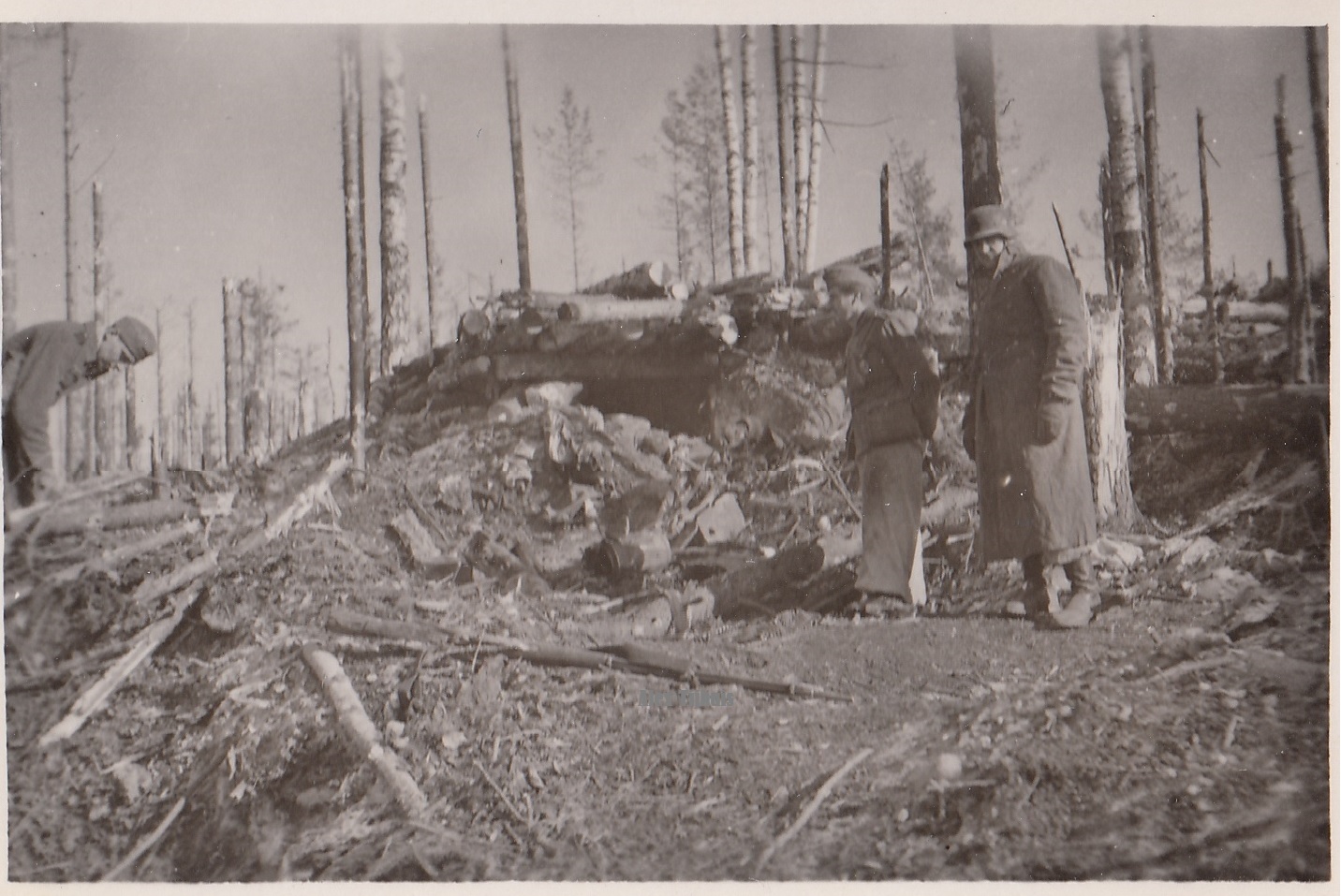 Duitse militairen inspecteren een stelling waar zeer recent gevochten is. Te zien zijn de enorme ravage en Russische doden. Daarnaast is er geposeerd bij een (veroverde?) mortier.