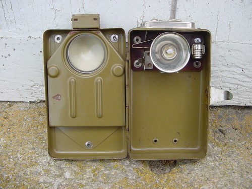 Ik heb al eens eerder iets over geschreven over de ''Codextra'' miltaire zeer degelijke zaklamp met drie filters geel, rood, blauw heeft drie aparte voorzet hendels zoals bij de meeste militaire Codextra lampen van destijds.De lamp heeft een fraaie kunstzinnig gevormde draadbeugel productie jaren 1930/1940 in originele mintgroene hamerslagverf uitgevoerd,deze lampen kom je ook niet zo vaak tegen.