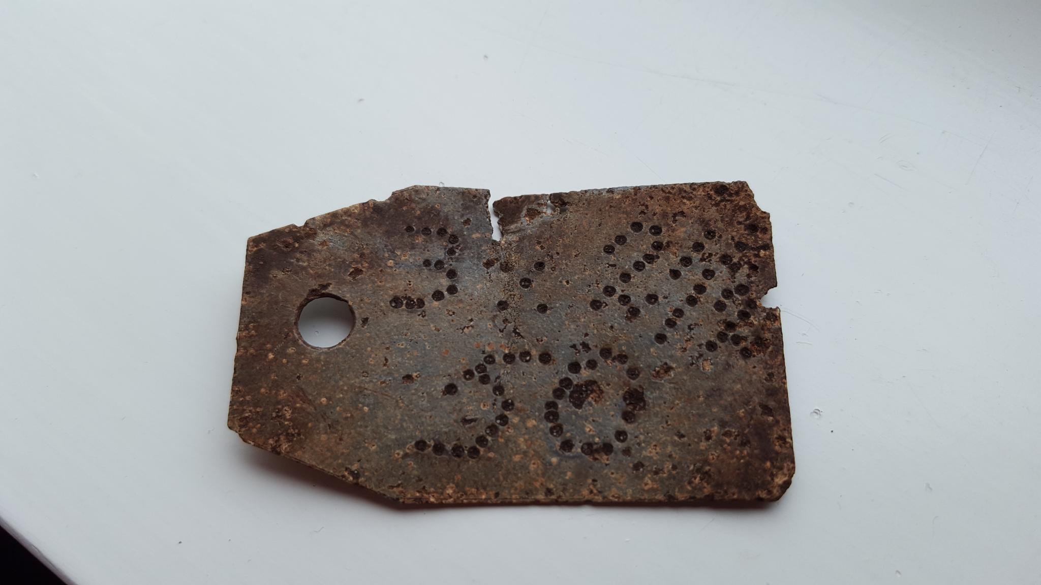 Gevonden op de plek waar barakken stonden van een bunkerpark. Het lijkt op een stukje metaal die zelf geknipt is uit iets en er cijfers in heeft geslagen.