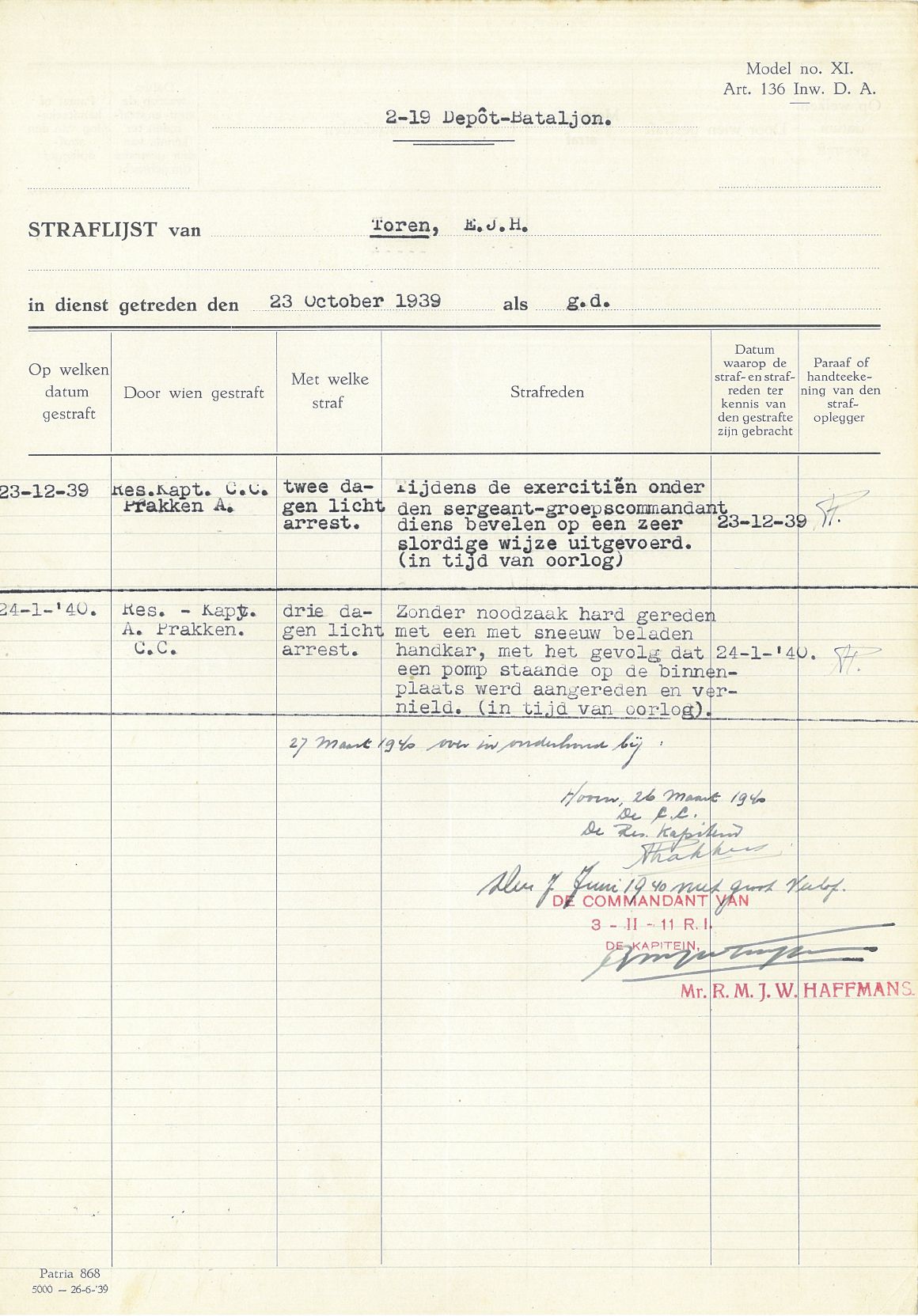 De straflijst van mijn opa. Met boven aan: 2-19 Depot-Bataljon