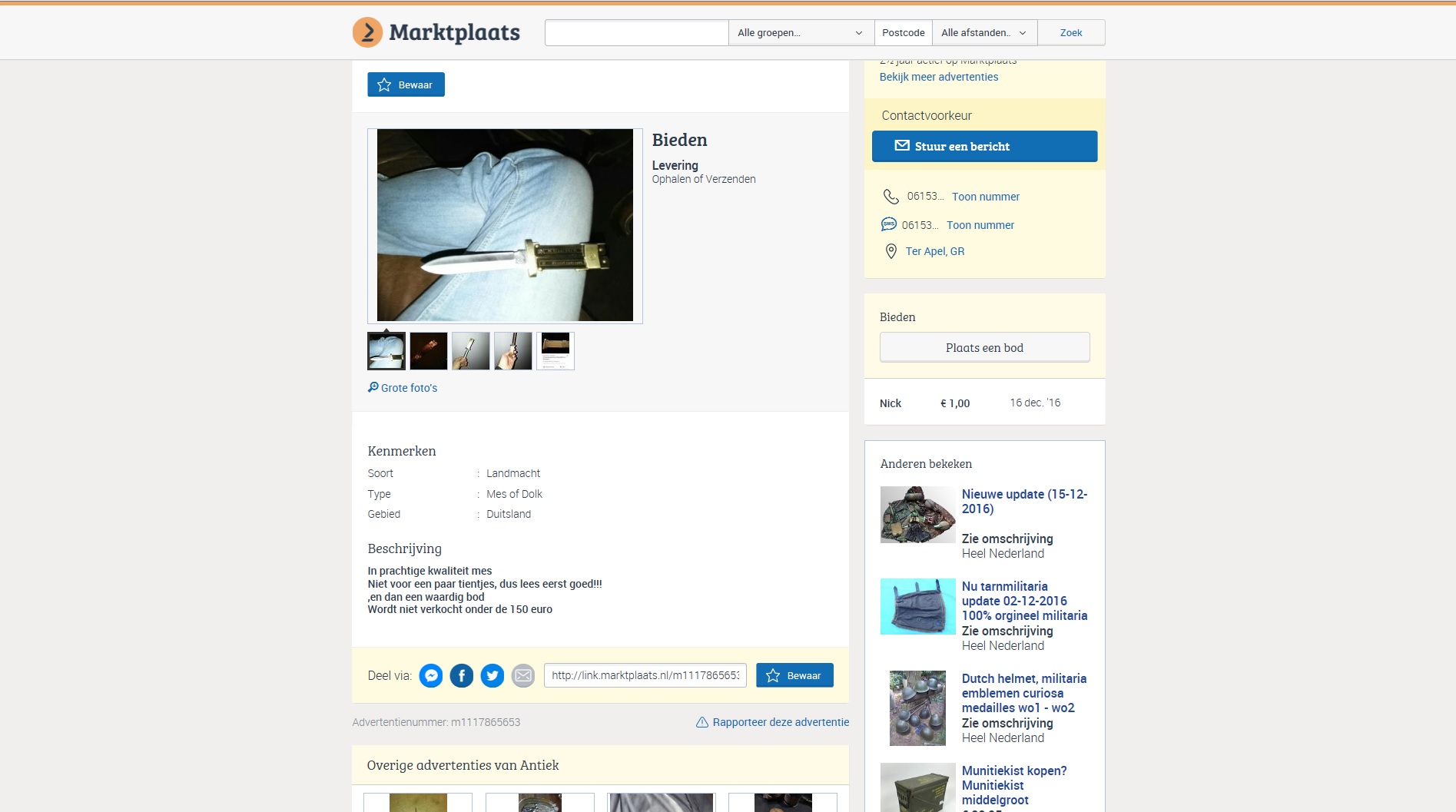 Hij heeft de advertentie aangepast !!! Stond eerst dat het een orgineel ss mes was !! En er gaat niemand door onze dak !!!