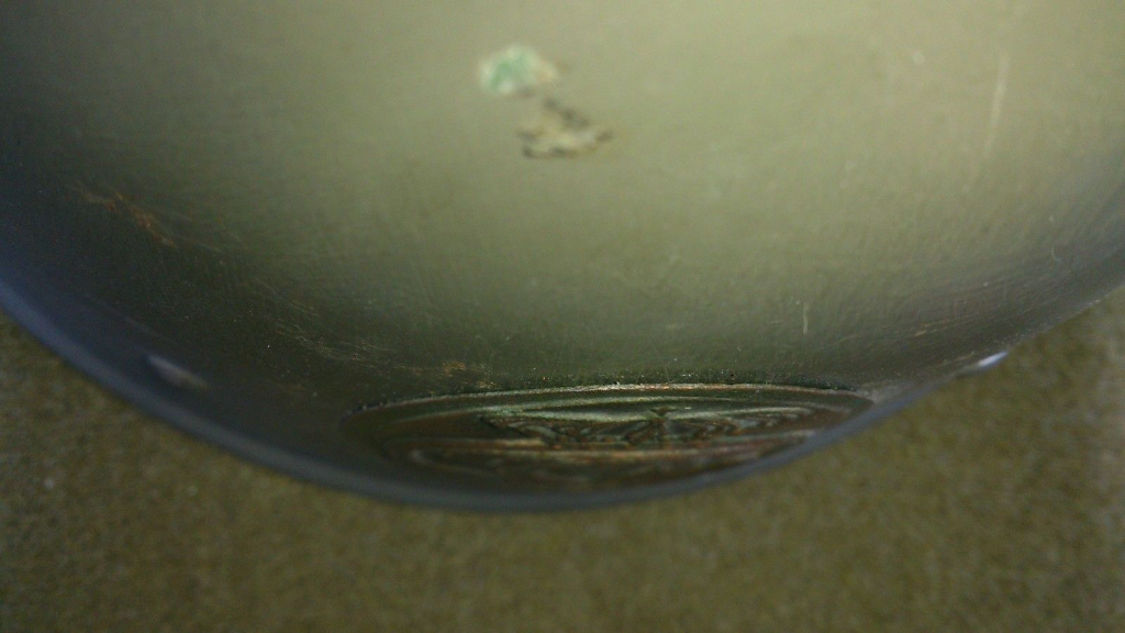 Echter, deze helmplaat is later op deze helm gemonteerd. Dit hoeft niet perse vals te zijn aangezien dit vaker gebeurde in 1944 na de machtswisseling. Dit is in dit geval niet het geval, duidelijk te zien aan de kleur verf en het feit dat de helm onbeschadigd lijkt te zijn. Verf is er dus niet zo heel lang geleden aangebracht.