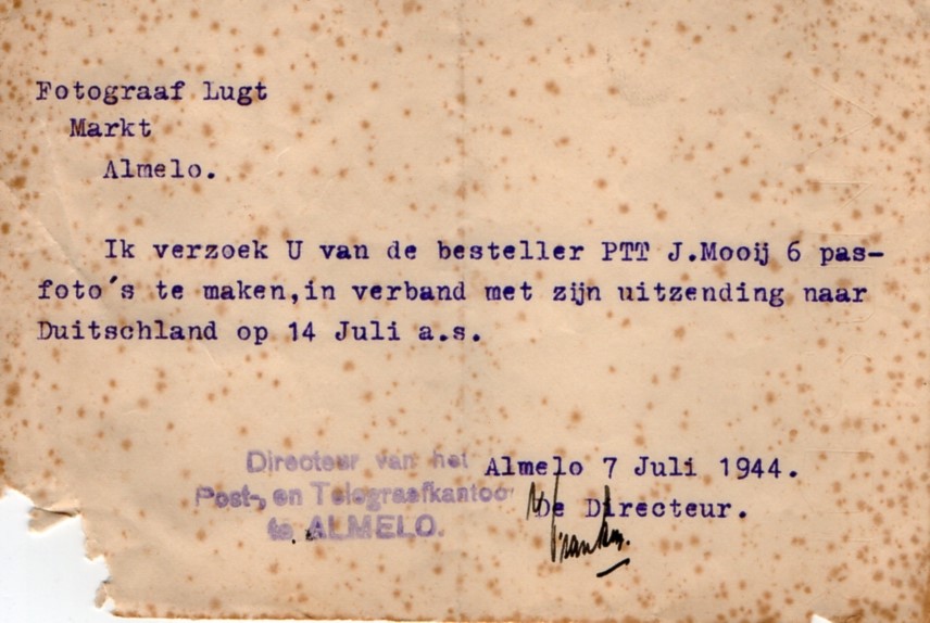 Een 5 tal documenten van J.W.L.F. Mooij hij was postbode in Almelo. Hij kreeg in juli 1944 het bericht dat hij naar Duitsland moest om daar te gaan werken voor de Duitsche Dienstpost. Of hij dat is gaan doen is onduidelijk.. er zat ook een papiertje bij dat hij nog loon moest ontvangen van Vrij Nederland. Dat tijdens zijn onderduikperiode niet was uitgekeerd.
