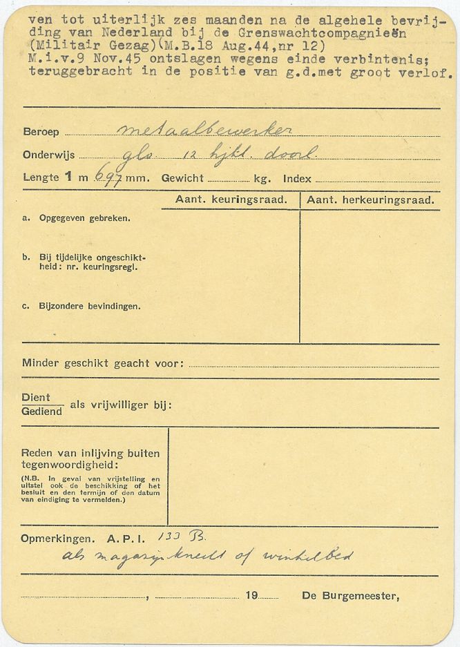 Een 5 tal documenten van J.W.L.F. Mooij hij was postbode in Almelo. Hij kreeg in juli 1944 het bericht dat hij naar Duitsland moest om daar te gaan werken voor de Duitsche Dienstpost. Of hij dat is gaan doen is onduidelijk.. er zat ook een papiertje bij dat hij nog loon moest ontvangen van Vrij Nederland. Dat tijdens zijn onderduikperiode niet was uitgekeerd.