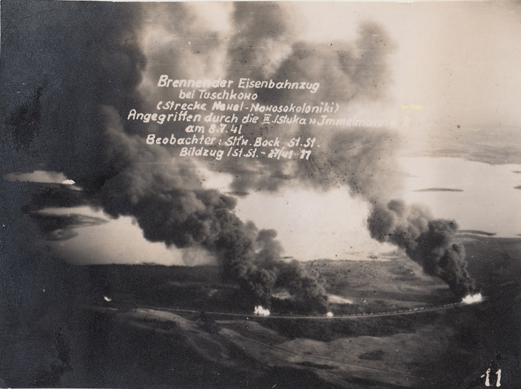 De eerste is genomen boven de Rupel Pass en laat het bombarderen zien van Griekse doelen. De tweede foto is gemaakt in Rusland en laat een brandende trein zien.