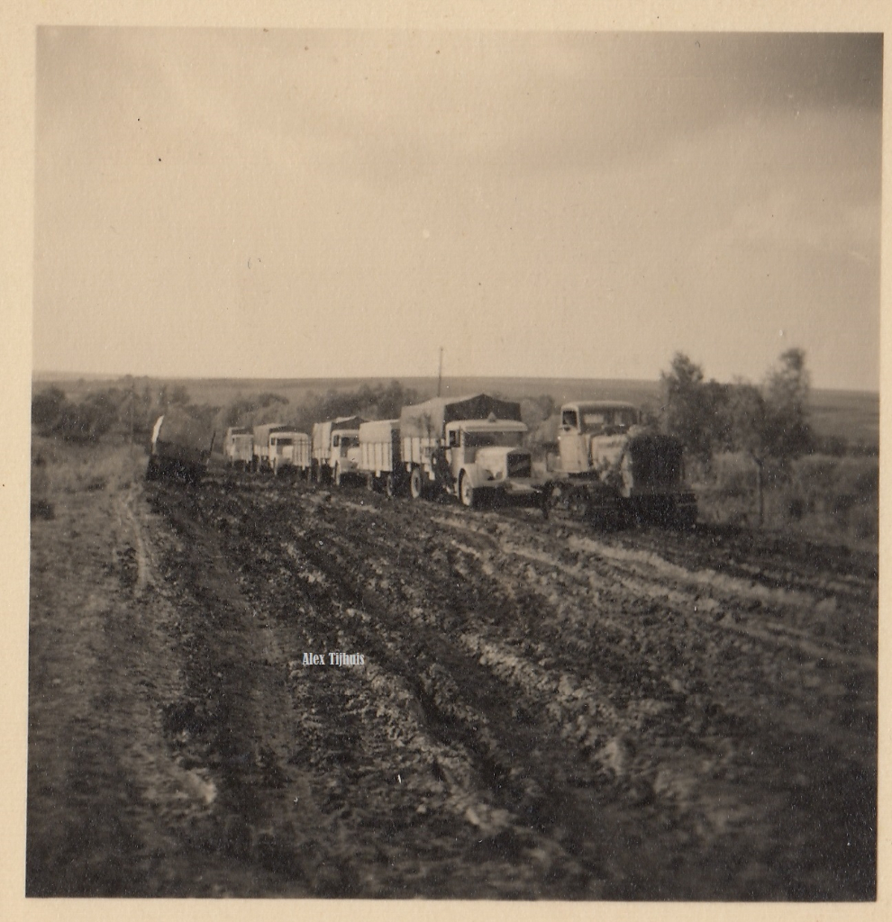 ChTZ S-65, een Russische tractor, trekt een colonne Duitse vrachtwagens voort door de modder.