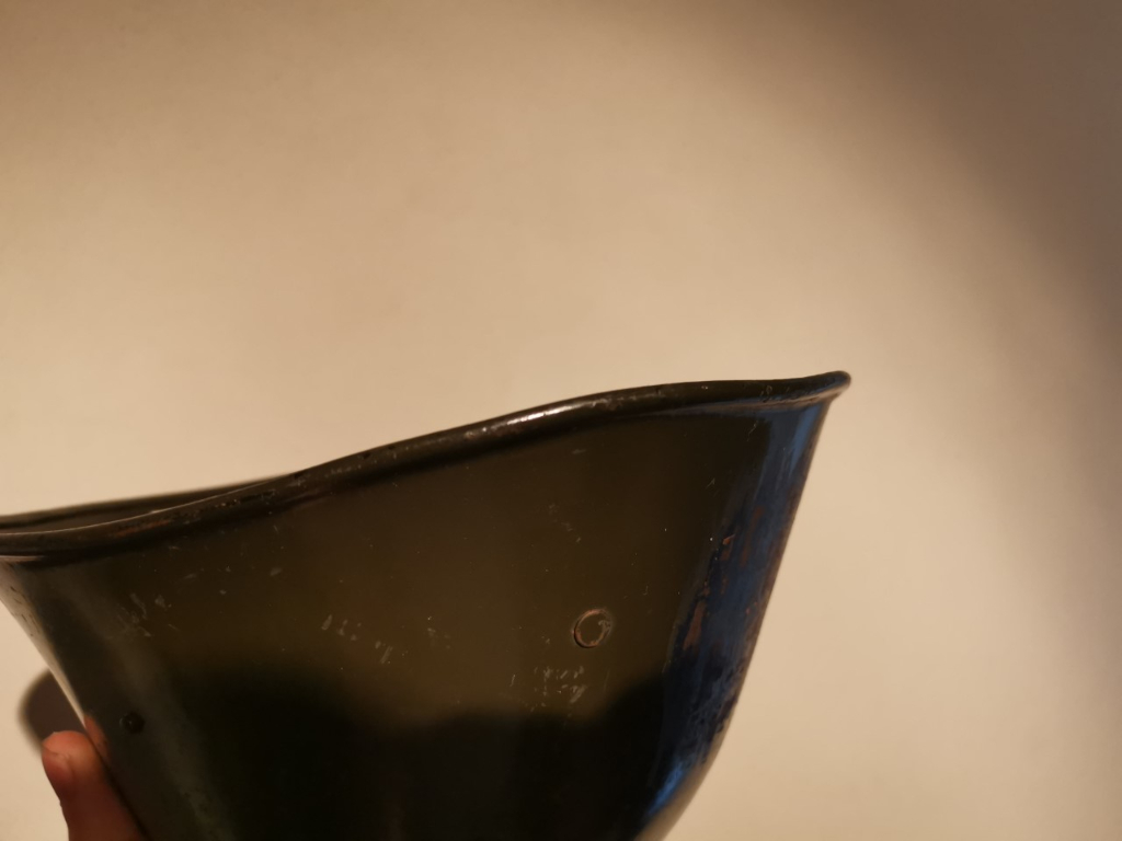 De helmschaal is aan de binnenkant zwart, en hij is naderhand groen overgeschilderd met een olie-achtige verf. Er zitten krassen waar de helmplaat gezeten moet hebben, en er zijn sporen van witte en rode verf te zien op de groene verf waar de helmplaat gezeten moet hebben. Ik kan echter niet echt sporen aantreffen van de helmplaat zelf, en ik vind de krassen op de locatie ook wel erg kunstmatig ogen.