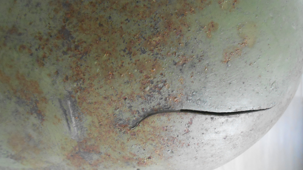 Zie ook de ''concussion fracture'' of explosie barst voorop de helm die door de beschieting ontstaan is. Verder onderzoek is nog aan de gang.