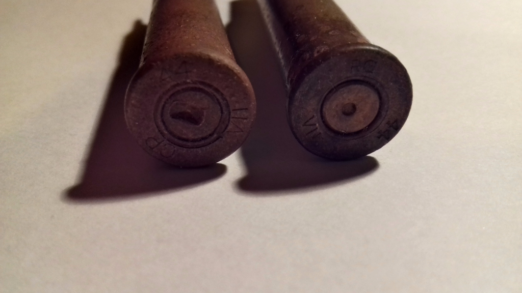 Links is op de stempel te lezen CP-44-VII en rechts RG-44-VII. Indien mijn bronnen correct zijn, zou de linker huls geproduceerd zijn in de VS en de rechter huls in Engeland (beide in 1944). Wat opvalt is de onderscheidende vorm van de 'afdruk' in het midden, wat zou duiden op het gebruik van de hulzen in verschillende vuurwapens. Aanvullende informatie over deze hulzen is altijd welkom!