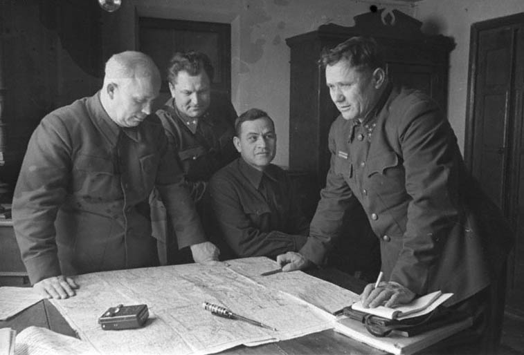 Meeting of the Military Council of the Stalingrad Front: from left to right - N.S. Khrushchev, A.I. Kirichenko, secretary of the Stalingrad Regional Committee of the CPSU (b) A.S. Chuyanov and the commander of the front, Colonel-General A.I. Eremenko