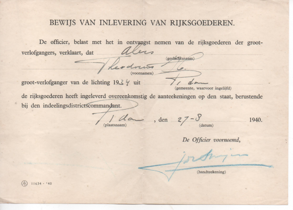 Het Oorlogszakboekje en bewijs van inleveren van Theodorus Hendrikus Alers geboren op 25-12-1914 te Rotterdam