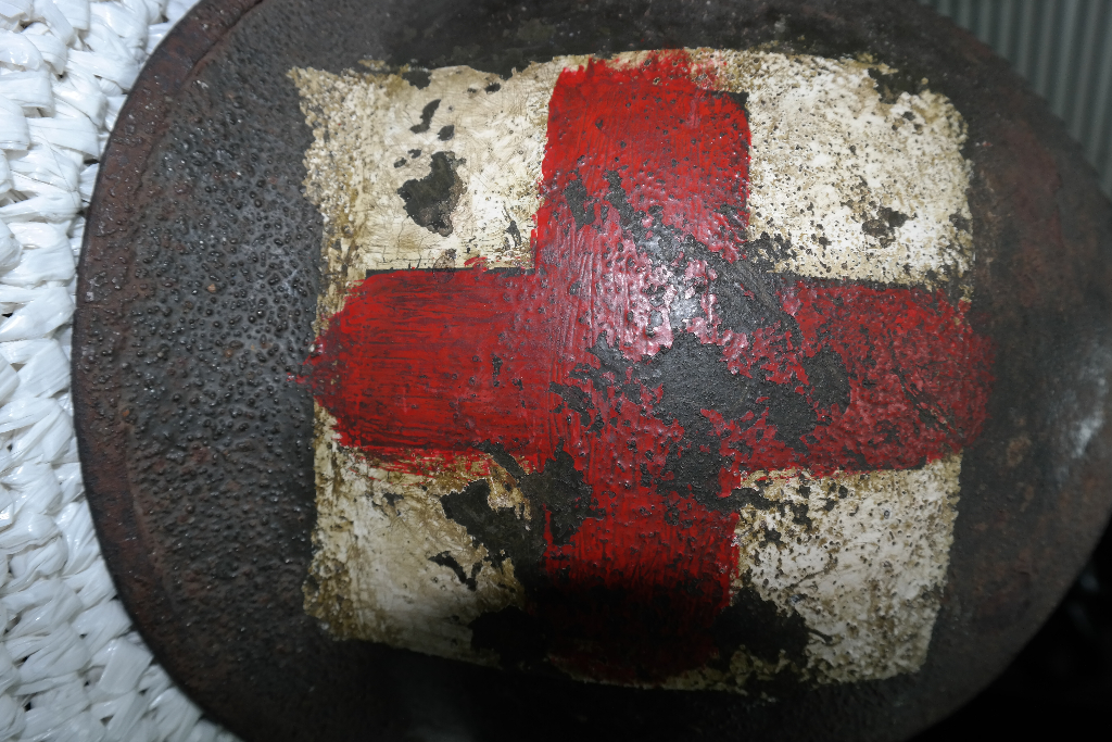Met andere woorden, de helm zelf is WO2 maar de laatste kleur groen en de markeringen zijn na-oorlogs.