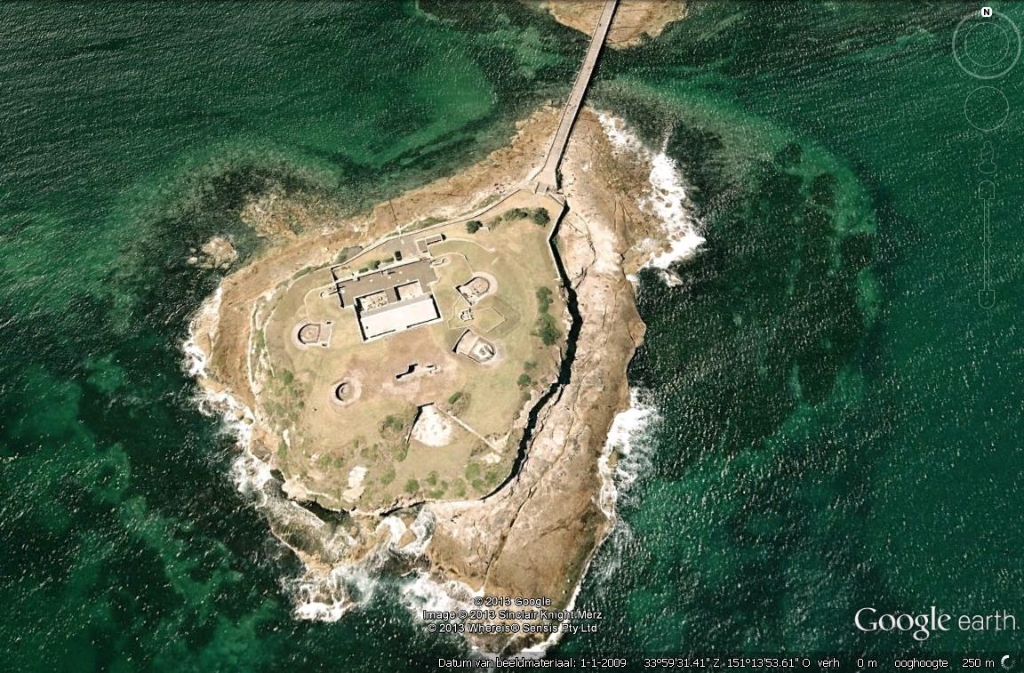 Een Google Earth luchtfoto van de drie batterijen die de Zuidelijke baai verdedigde van Sydney.