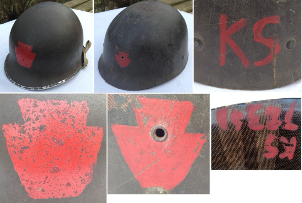 De 2e helm is een Amerikaanse 28th infantrie divisie helm, bekend van het Ardennen offensief. De helm heeft het embleem van de 28th divisie (blood bucket) op zowel de buitenschaal als de binnenhelm. Op de binnenhelm staan de initialen K.S. geschilderd, met aan de binnenzijde het laundry nummer. Helaas heb ik de naam van de soldaat nog niet weten te achterhalen.