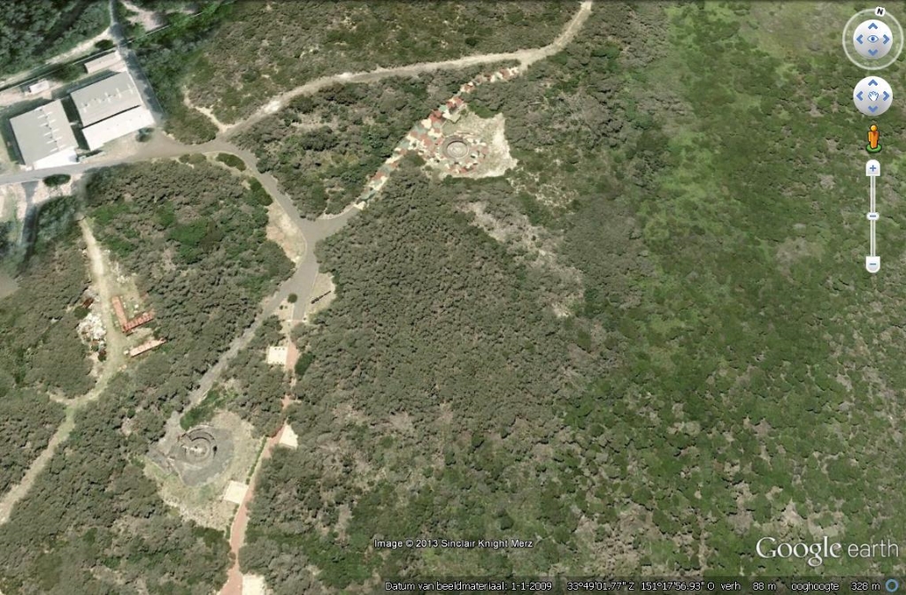 Een Google Earth luchtfoto van de drie batterijen die de Zuidelijke baai verdedigde van Sydney.
