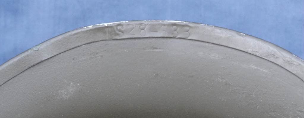 De vroege 1953 uitgaven van de M53 helm zijn voorzien van een witte stempel aan de binnenzijde van de helmbol. Ik durf niet voor de volle 100% te zeggen of bij deze vroege uitgaven ook iets in de rimband staat ingeslagen.