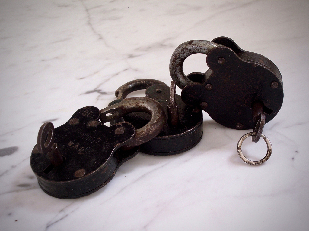 Een maand geleden vond ik drie hangsloten in een rommelwinkeltje. Mijn interesse voor de hangsloten werd gewekt door de "broad arrow" (W⥣D) die ik erop zag afgebeeld. De hangsloten zijn van het merk Union en twee ervan zijn gedateerd, 1944 en 1945. Ze zijn compleet met de sleuteltjes. Aanvankelijk waren de sleuteltjes lastig om te verdraaien vanwege de roest maar met een druppeltje olie was dit probleem snel verholpen.