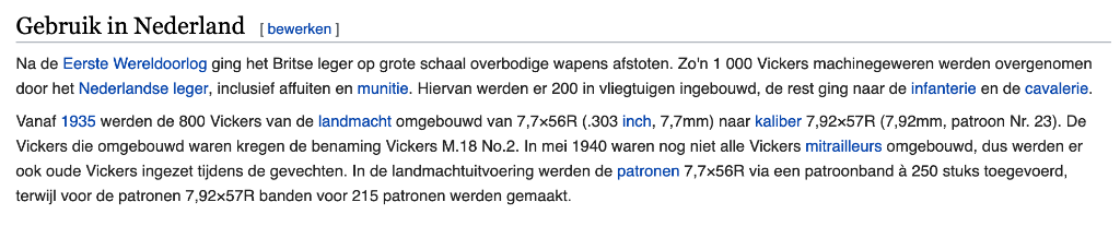 tnx, Ik ga het navragen bij het lokale museum. Volgens wikipedia zijn de meeste Vickers aangekocht van de engelsen en na 1935 geupgrade. "Vanaf 1935 werden de 800 Vickers van de landmacht omgebouwd van 7,7×56R (.303 British) naar kaliber 7,92×57R (patroon Nr. 23)"