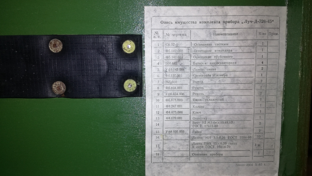 De kist is bedoelt om er het luch-d-726-45 (луч-д-726-45) artillerie (nacht)richtvizier in op te bergen. Het papier op de binnenzijde van de kist geeft de inhoud weer.