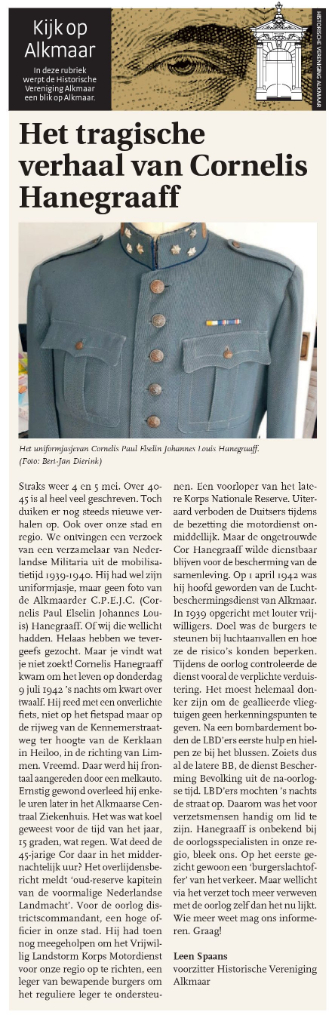 Op 1 april 1942 benoemd tot hoofd Luchtbeschermingdienst te Alkmaar. Maar op 9 juli 1942 tijdens een nachtelijke terugtocht per fiets naar huis wordt hij op de straatweg richting Heiloo aangereden door een hem tegemoet komende melkauto. In het ziekenhuis overlijdt hij aan zijn verwondingen. De heer Hanegraaff was secretaris van de Winterhulp in Alkmaar.