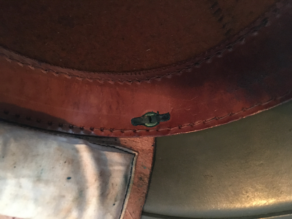Nu staan er in de helm twee nummers. Eentje gekrast in de nek (6861), de ander gekrast in het leder (volgens mij staat er 6557, maar slecht te lezen). Ook staan er op twee plaatsen de initialen "JO" in de helm gekrast.