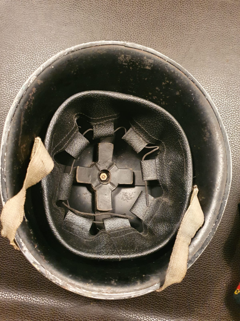 Deze helm afgelopen weekend gekocht, Het binnenwerk deed mij denken aan na-oorlogs en omdat ik deze wel kon gebruiken voor onderdelen besloot ik gisterenavond het binnenwerk te verwijderen. Te beginnen met de schroef en het kussentje. Tot mijn eigen verbazing stuitte ik op een 1944 gedateerd binnenwerk met als maker D.M.C en (maataanduiding) S. De MKIII helm is overigens 1944 BMB gedateerd.