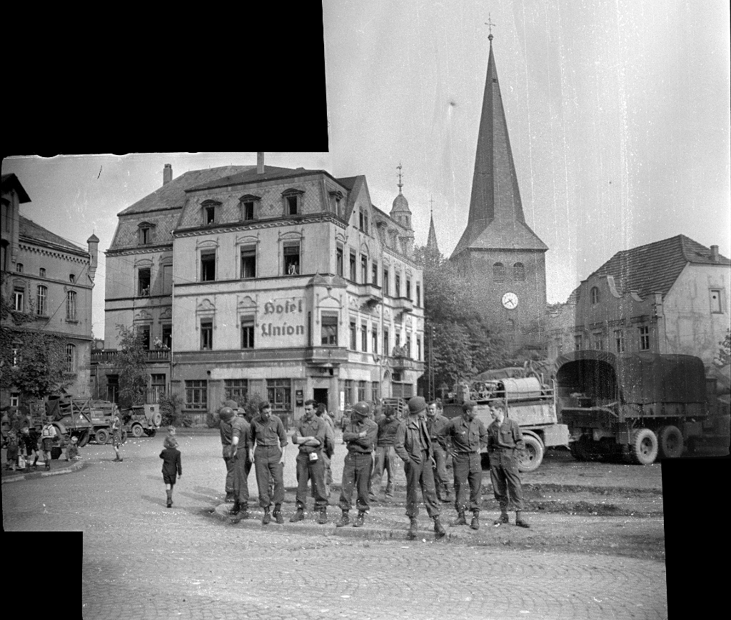 Op de achterkant van 1 van de afdrukken staat geschreven: "Town Square, Hüsten, Germany. We spent one night in the Hotel Union, a musty old bed. Our vehicles (A's) practically filled up the square"