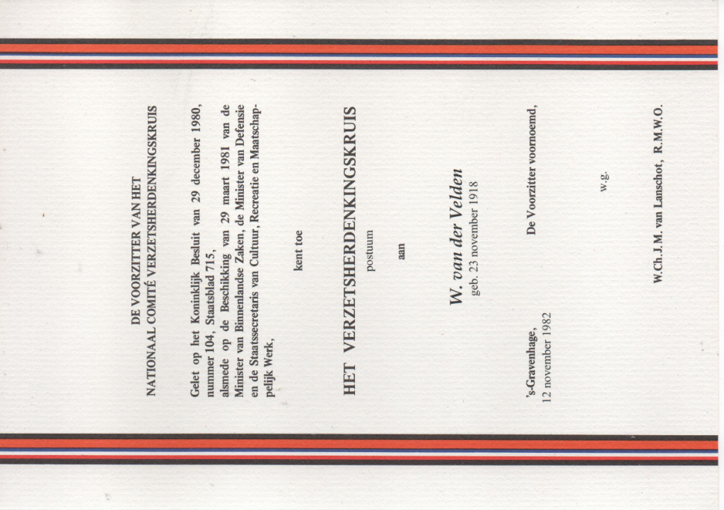 De oorkonde van zijn postuum uitgereikte Verzetsherdenkingskruis: