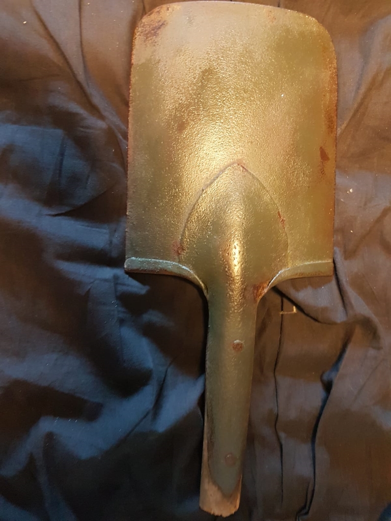 Ik kwam ergens op het web tegen dat dit een Britse variant van de Amerikaanse m43 schep kan zijn(alleen geen duidelijke foto's). Kan kloppen want er staat volgens mij MADE IN UK in gestempeld(al lijkt de U op een O maar dat kan aan de roest liggen. Het heeft ook wel wat af van een NVA schep. De schep komt uit België, werd aangeboden als Amerikaans in een lot en de verf is niet origineel(dat ga ik eraf halen).