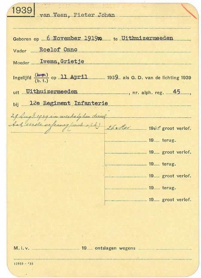 Het buiten model uniform van Pieter Johan van Veen, geboren op 6 november 1919 te Uithuizermeeden. Op 29 augustus 1939 in dienst gegaan bij de 7e compagnie 12e Depotcompagnie. Later bij de 4e compagnie. En op 10 mei 940 onder gebracht bij het 2-10e Grensbataljon. Wat als taak had de telefooncentrale in Wijk aan Zee te beveiligen. Deze lag aan de rand van stelling IJmuiden. HELAAS na mei 1940 omgebouwd tot zondagspak..