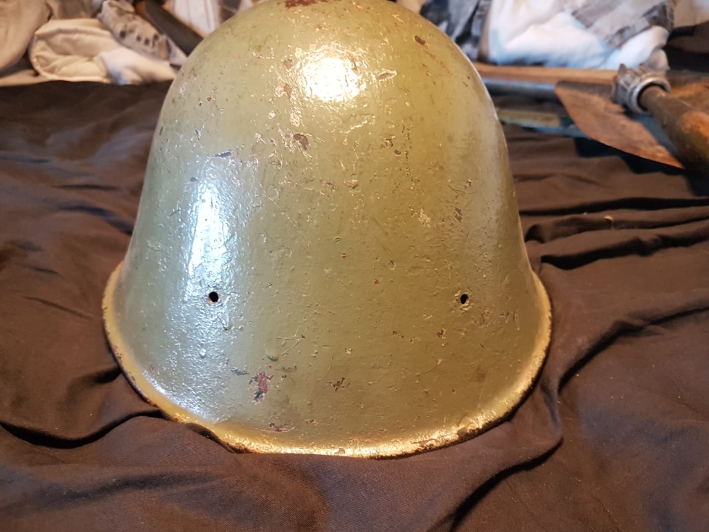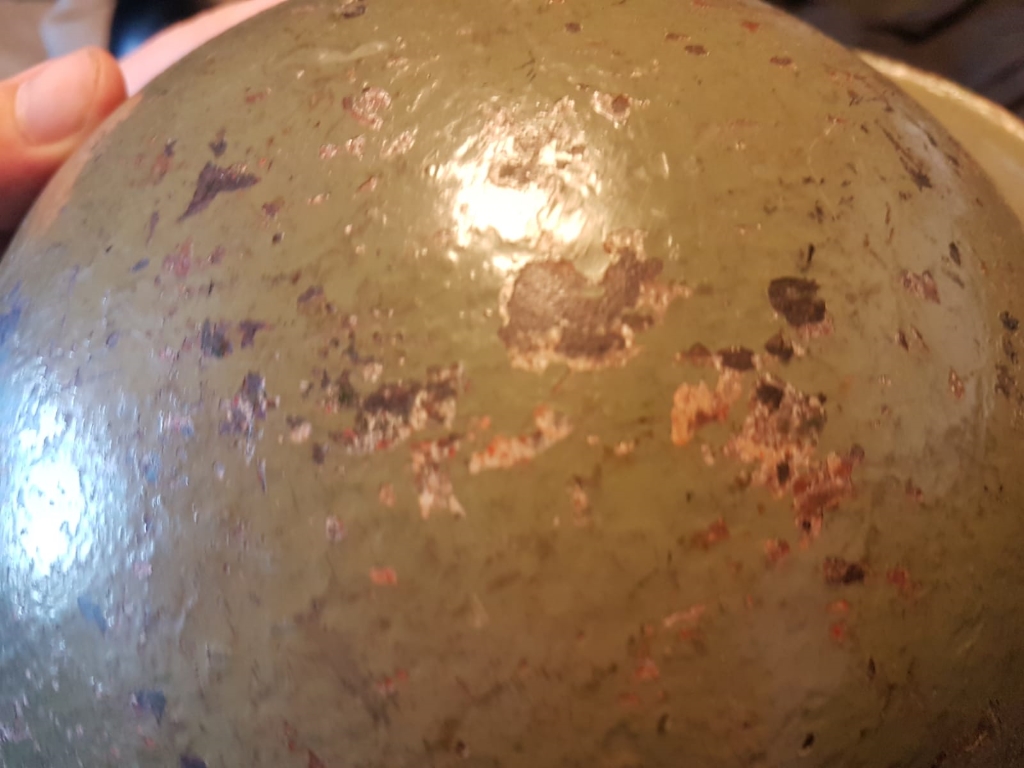 De appelgroene is volgens mij ook een Nederlandse m27? Onder de laag appelgroene verf zitten plekjes die lijken op de originele donker groene verf. De helm heeft een zwarte binnenkant, en restanten van waar een binnenwerk heeft gezeten.