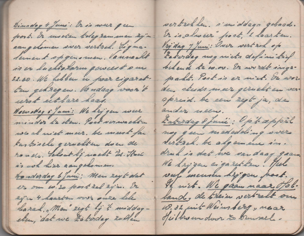 Gisteren een hele mooie schenking mogen ontvangen van de nicht van Willen van der Velden. Zij had bij het opruimen van haar zolder zijn agenda/zakboekje terug gevonden. Hierin staan aantekeningen tijdens zijn opleiding in Utrecht. En zijn verslag van wat hij heeft mee gemaakt in mei 1940 en hoe zijn krijgsgevangen tijd verliep. Een hele mooie aanvulling op een toch al heel bijzonder verhaal.... nu zijn overjas uit 1940, zijn VHK oorkonde en dit boekje in de verzameling.