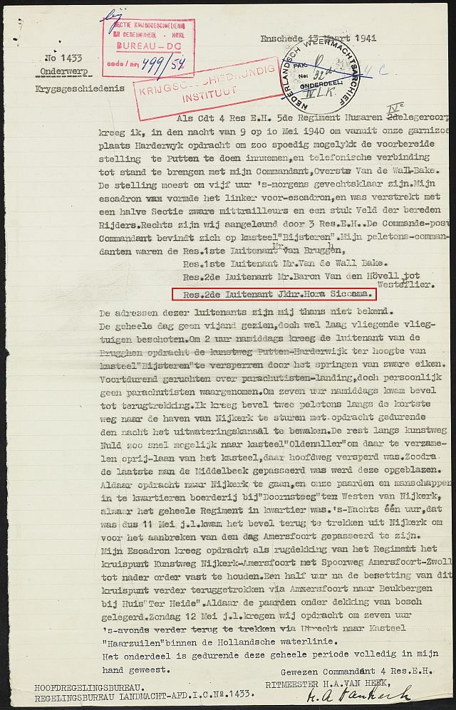 deze week 2 uniformjasjes van jhr. mr. Wiardus Jacob Hendrik Duco Rengers Hora Siccama (1916-1945) toegevoegd aan de verzameling. Hij werd geboren op 15 maart 1916 te Düsseldorf. En studeerde rechten aan de universiteit van Utrecht. Op 5 oktober 1936 begint hij aan zijn dienstplicht hij wordt uitgenodigd om deel te nemen aan de 20ste cursus bij de School van Reserve officieren Cavalerie (SROC) , van oktober 1936 tot juli 1937. Daarna zullen hij en zijn 25 medeleerlingen drie maanden doorbrengen als pelotonscommandanten. Een van die medeleerlingen is George Maduro. Die in tenminste een van zijn 46 brieven die hij tijdens zijn diensttijd schreef naar huis over Rengers Hora Siccama verteld. Na een feest- en excursieweek gaan de eenentwintig nieuwbakken kornetten naar hun verschillende regimenten, waar zij de komende drie maanden het echte legerleven zullen meemaken. Maduro en Wiardus Rengers Hora Siccama gaan naar het 4de Half-regiment in Deventer. Hun taak is om de huzaren die opkomen voor hun herhalingsplicht, klaar te stomen om deel te nemen aan de grote manoeuvres. Het valt ze niet mee. Op 9 september schrijft Maduro: Vanmorgen is de herhalingslichting opgekomen en U kunt zich geen flauw idee ervan vormen, wat Siccama en ik vandaag hebben moeten werken. Voor al die menschen kleeren, wapens enz. ontvangen en uitdeelen, paarden harnaschementen overnemen, menschen naar de dokter sturen, en dat met een ongeoefend, ongedisciplineerd zootje, want dat zijn deze herhalingspummels, die 3 jaar geleden het laatst gediend hebben. De twee weken, die voor de boeg liggen, zullen voor Siccama en mij (Groepscommandanten van het 1ste Peloton) geen pretje zijn. Onze pelotonscommandant is […] niet al te kundig, […] zoodat wij feitelijk de commandanten van het peloton zijn en voor alles en nog eens alles moeten zorgen. We gaan woensdag a.s. 15 Sept. voor 8 dagen op manoeuvre met ± 36 herhalingsmenschen te paard. Op 1 december 1939 word hij tegelijk met Maduro bevordert tot 2e luitenant. Tijdens de Mobilisatie van 1939-1940 word hij ingedeeld bij het 4e eskadron van het 5e regiment huzaren wat als garnizoensstad Harderwijk had. In van nacht van 9 op 10 mei 1940 krijgen ze het bericht om stelling in te nemen bij Putten. Later die dag krijgen ze het bevel de haven van Nijkerk te bewaken en op 12 mei kregen ze het bevel terug te trekken naar kasteel Haarzuilens. Waar ze te horen kregen dat Nederland heeft gecapituleerd. Op 30 september 1944 is Rengers Hora Siccema weer in Putten nu met 7 andere verzetsmannen. Ze plegen een aanslag op een auto met daarin 4 Duitse militairen. De gevolgen voor deze aanslag zijn verschrikkelijk voor Putten. Uiteindelijk kost het 552 manen hun leven…. Op 9 november worden Van Geen en zijn vriend Wiardus Rengers Hora Siccama – tevens verloofde van zus Cocky – gearresteerd, omdat ze zich niet hebben gemeld voor de Arbeitseinsatz. Ze belanden in kamp Amersfoort, maar op 31 januari 1945 worden ze samen voor verhoor teruggehaald naar de Willem III-kazerne in Apeldoorn. Door het doorslaan van verzetsstrijder Luther Kortlang uit Ermelo begrijpt de SD dat er piloten ondergedoken hebben gezeten op Huize Bijstein en dat de beide mannen meer op hun kerfstok hebben dan aanvankelijk gedacht. De jongens proberen onderweg naar de kazerne uit de auto te ontsnappen. Er ontstaat een gevecht met de SD’ers die hen bewaken, waarbij Wiardus zwaar gewond raakt en overleed na aankomst in het ziekenhuis van Apeldoorn. Hij werd aanvankelijk begraven op 6 februari te Ugchelen, maar later in 1976 herbegraven in Loenen (Gld.) Vak D grafnummer 389.